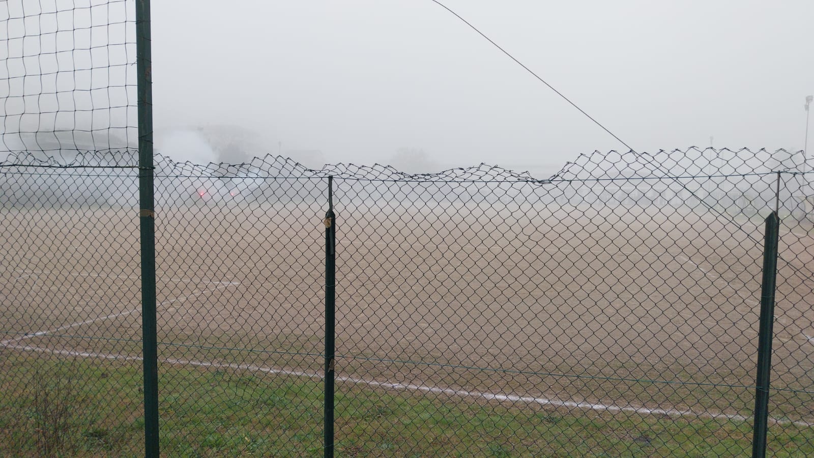 La gara di questa mattina fra il Theodicea e l'Isola Liri calcio è stata rinviata per nebbia. Una decisione che ha destato molte perplessità e il forte disappunto dei numerosi tifosi isolani. Nella foto, scattata alle 11,39, con la nebbia che si era alzata.