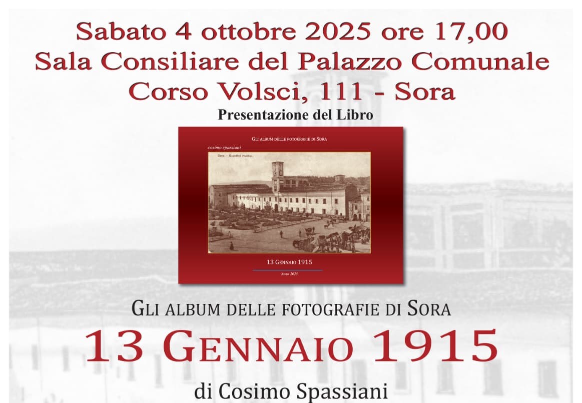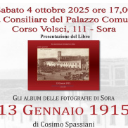 Domani, Sabato 4 ottobre alle ore 17,00 presso la Sala Consiliare del comune di Sora in corso Volsci, Cosimo Spassiani presenterà il suo ultimo libro: “Gli album delle fotografie di Sora 13 Gennaio 1915”.