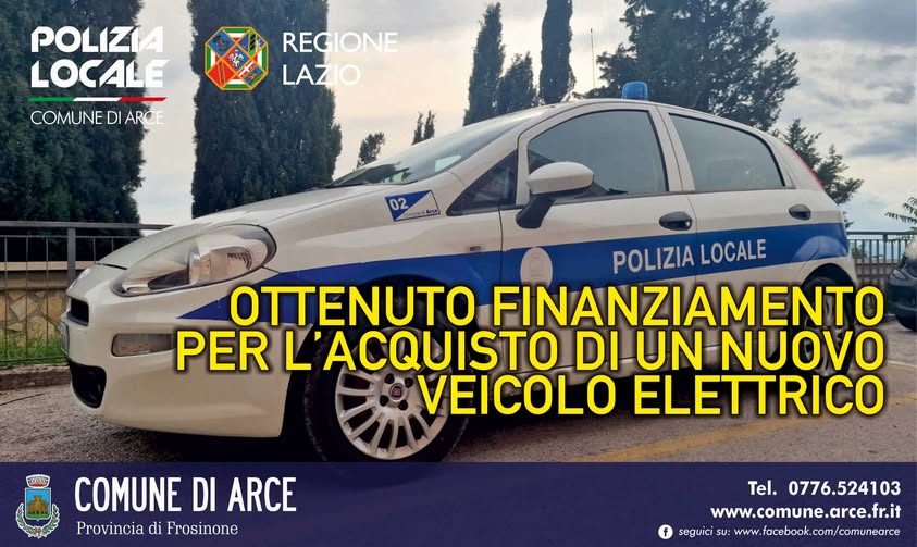 Il Comune di Arce ha ottenuto un finanziamento di 20.000 euro dalla Regione Lazio nell’ambito dell’Avviso Pubblico “Polizia Locale 4.0”. Grazie a questo contributo, l’Amministrazione comunale potrà procedere all’acquisto di un nuovo veicolo elettrico o ibrido, destinato al Corpo di Polizia Locale.