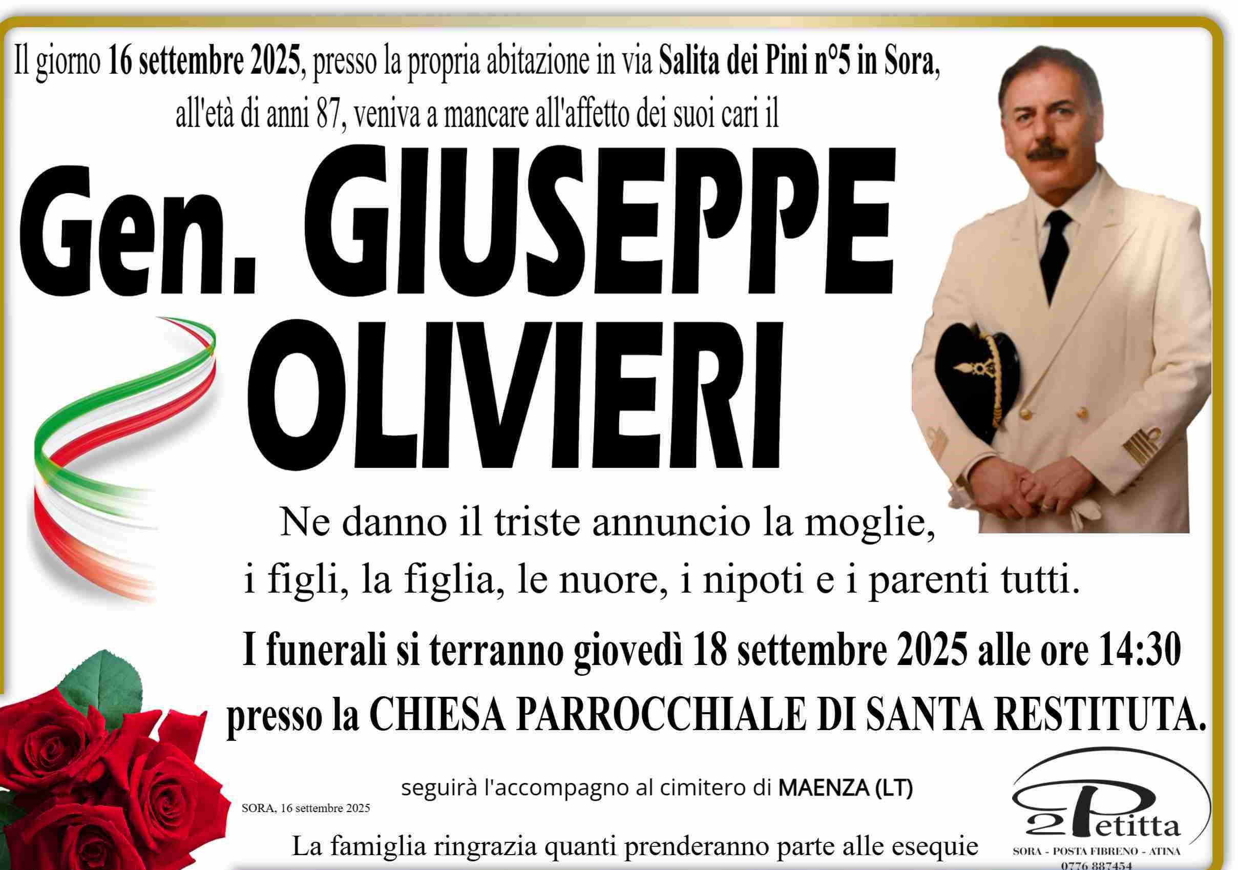 Il Generale Giuseppe Olivieri si è spento ieri nella sua abitazione di via Salita dei Pini a Sora. Aveva 87 anni