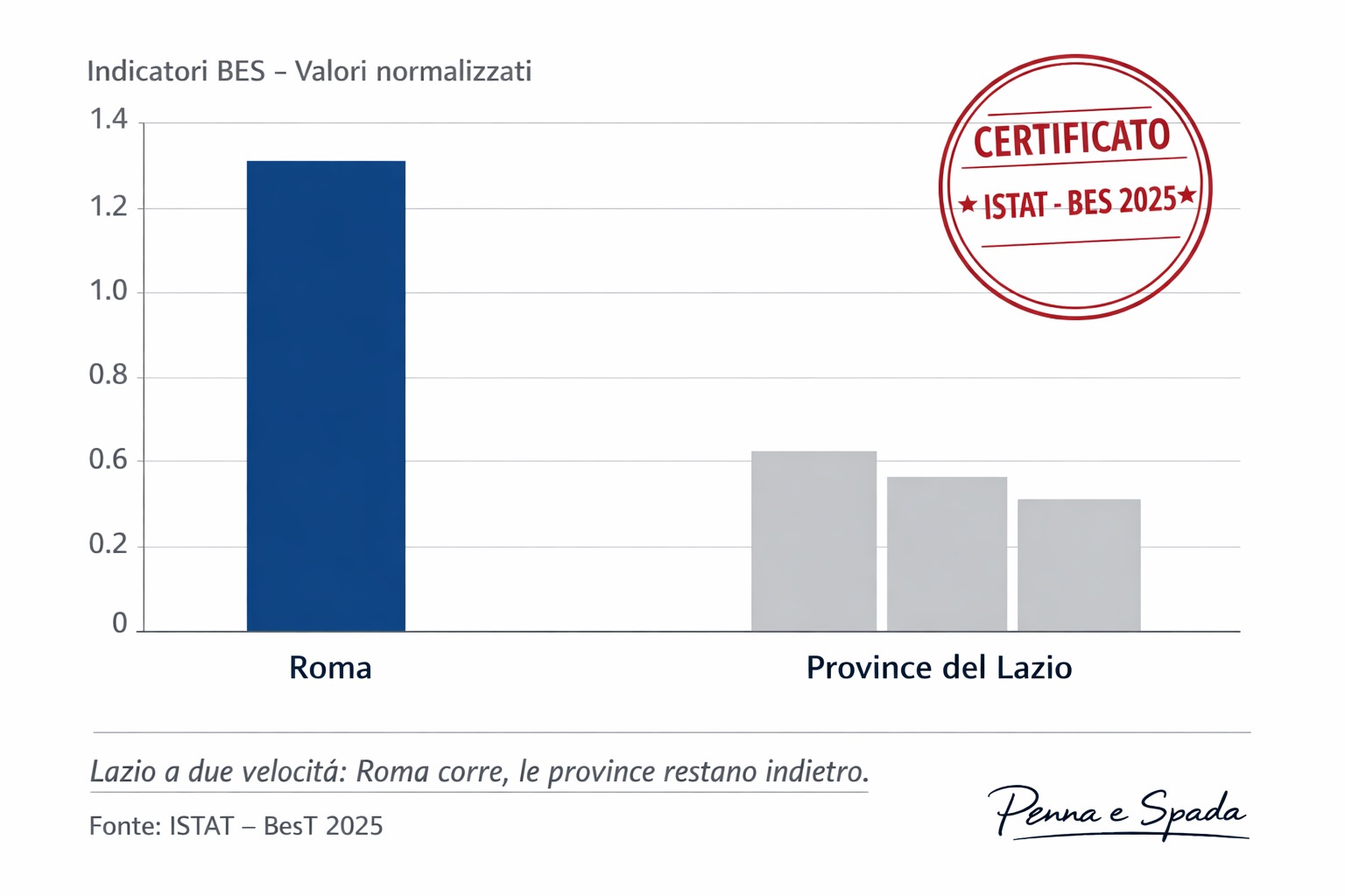 Il rapporto BesT 2025 dell’Istat certifica ciò che Penna e Spada ripete da tempo: il Lazio non cresce in modo armonico, cresce dividendo. Roma avanza, concentra reddito, servizi, opportunità, innovazione. Le province restano indietro, intrappolate in un equilibrio fragile fatto di salari bassi, occupazione debole, fuga dei giovani e scarsa capacità di attrarre investimenti. Non è una fotografia improvvisa, è la conferma di un processo lungo, costante, strutturale.