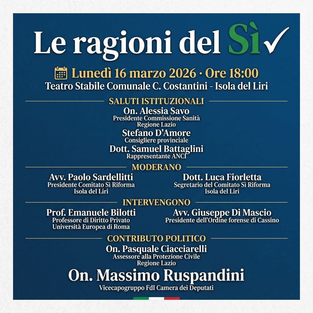 A Isola Liri il dibattito sul referendum entra nel vivo e lo fa con un appuntamento pubblico che punta a portare il confronto direttamente tra i cittadini. Lunedì 16 marzo, alle ore 18, il Teatro Stabile Comunale “C. Costantini” ospiterà infatti l’incontro dal titolo “Le ragioni del Sì”, promosso dal comitato territoriale che sostiene la riforma e che nelle ultime settimane ha avviato una serie di iniziative informative sul territorio.