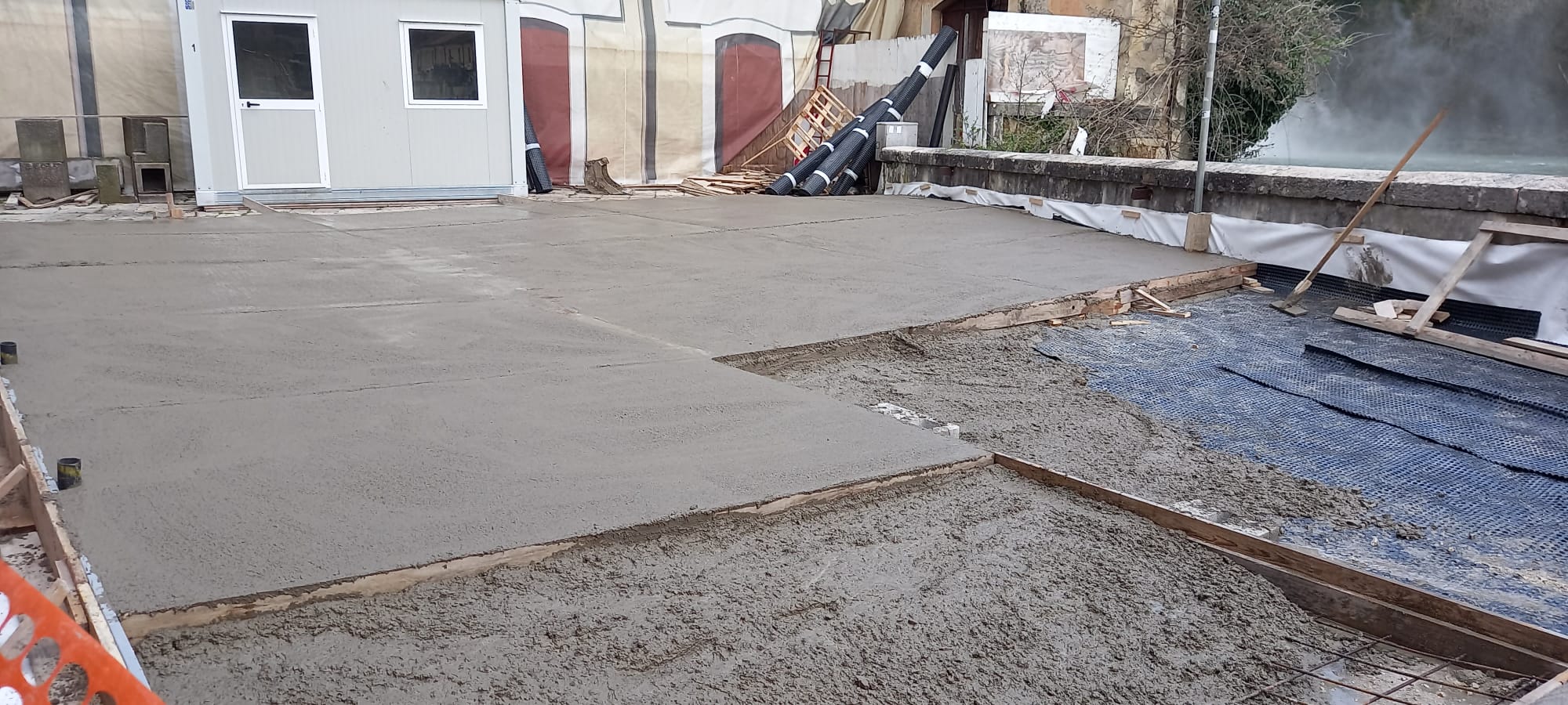 Così come avvenne qualche anno fa in piazza XX Settembre, per proteggere l’antico basolato dei “Navigli isolani”, la ditta appaltatrice dei lavori sta opportunamente realizzando una pavimentazione in cemento. (Nella foto).