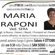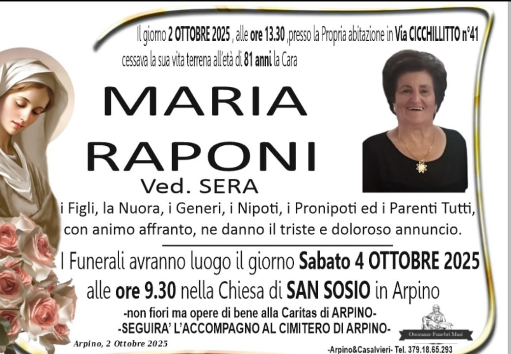 Nel primo pomeriggio di oggi nella sua abitazione di via Cicchillitto ad Arpino si è spenta Maria Raponi – Sera. Aveva 81 anni ed era la madre del vice sindaco Massimo Sera.