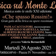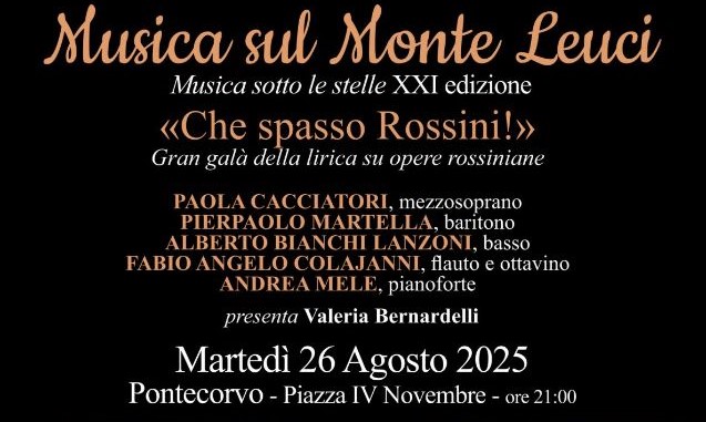 Domani, Martedì 26 agosto, in Piazza IV Novembre a Pontecorvo, alle ore 21.00, si terrà il secondo degli appuntamenti estivi della rassegna “Musica sul Monte Leuci” giunta alla XXI edizione. L’evento, organizzato dal Comune di Pontecorvo e il Museo delle Battaglie, in collaborazione con la BPC Pontecorvo e l’Assoflute Associazione Musicale, si presenta a questo secondo appuntamento, come di consueto, con un concerto lirico dal titolo "Che spasso Rossini!".