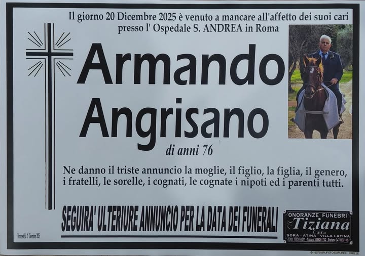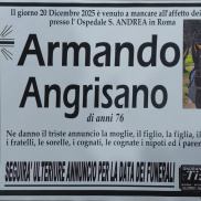 I funerali del 76enne Armando Angrisano non sono stati ancora fissati. L'uomo, stimato fabbro di Broccostella, si è spento ieri al Sant’Andrea di Roma a causa di un malore improvviso mentre si trovava a Roma al matrimonio della figlia.