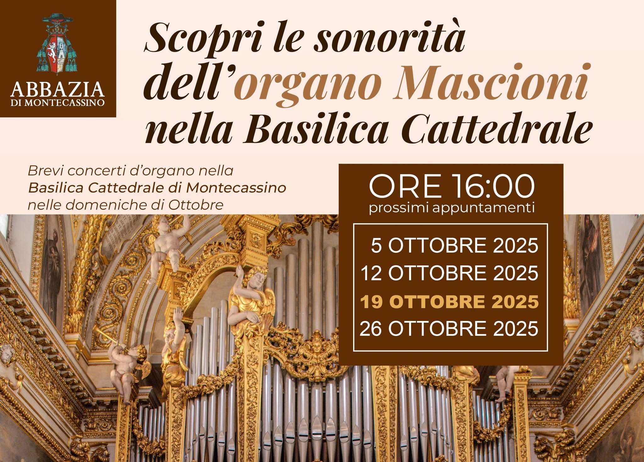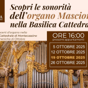 Proseguono gli appuntamenti della stagione musicale promossa dall’Abbazia di Montecassino. Anche nella terza domenica di ottobre, la Basilica Cattedrale ospiterà un nuovo concerto della rassegna d’organo del maestro David Reccia Chynoweth, che oggi, a partire dalle ore 16.00, delizierà il pubblico guidando il monumentale organo Mascioni, tra i più grandi d’Italia.