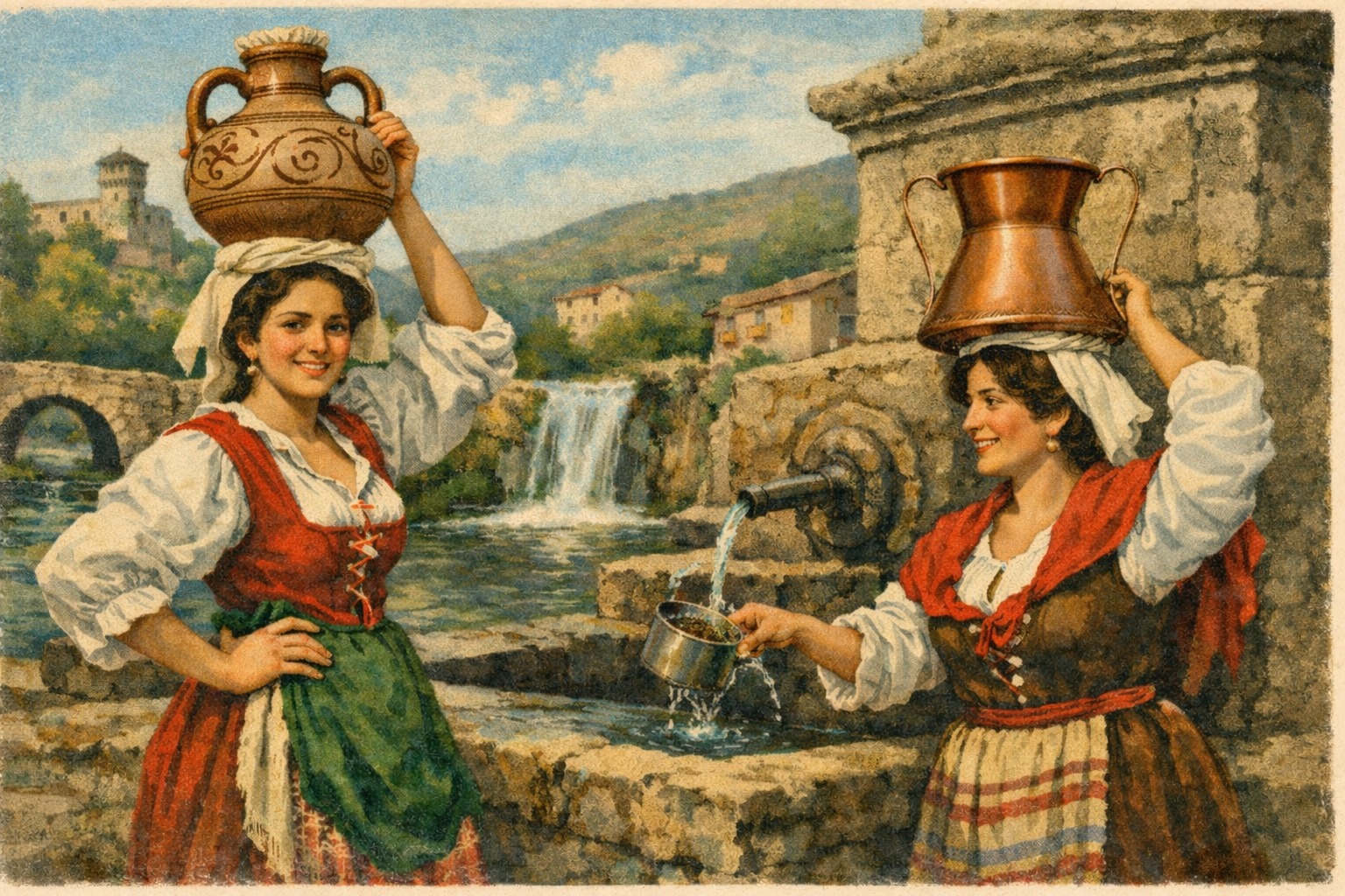 La conca di rame, invece, aveva altre qualità. Era robusta, riparabile, durava nel tempo. In molte zone laziali e appenniniche era diffusa e apprezzata. Inoltre era bella da vedere: il rame lucido colpiva l’occhio di pittori e fotografi. Quando tra fine Ottocento e inizio Novecento si iniziò a “mettere in scena” il folklore, la conca divenne l’oggetto perfetto per rappresentare la donna ciociara. Più scenografica, più iconica.