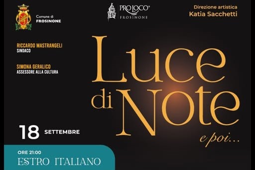 Dopo il successo straordinario della prima edizione, torna a Frosinone l’atteso evento musicale “Luce di note e poi…”. La manifestazione, patrocinata dal comune di Frosinone mediante l’assessorato alla Cultura di Simona Geralico, è realizzata con il supporto della Pro Loco e del Comitato Tecnico Artistico Culturale e con la direzione artistica del M° Katia Sacchetti.