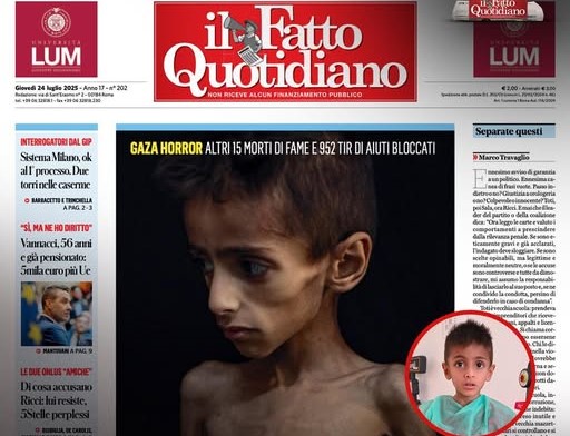 Il caso è, ancora, quello di Osama al-Raqab, il bimbo di Gaza immortalato scheletrico, a maggio, in un reportage fotografico dell’agenzia Associated Press, ripreso da numerosi media internazionali e, la settimana scorsa, pure sul Fatto, per denunciare l’aumento esponenziale dei morti per fame a Gaza, dovuto a mesi di blocco degli aiuti umanitari in un conflitto lungo 22 mesi che ha ucciso quasi 60 mila persone, costretto due milioni a vari spostamenti forzati, raso al suolo tre quarti degli edifici e azzerato le infrastrutture. Un conflitto che in molti, qualcuno anche in Israele, cominciano a definire genocida.