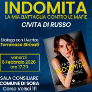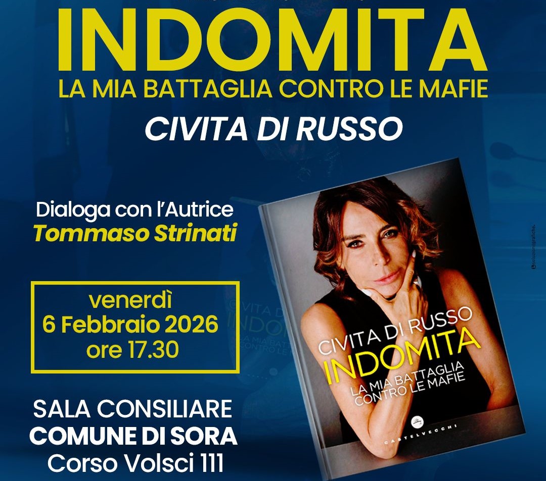 Il Comune di Sora promuove un appuntamento culturale dedicato ai temi della legalità e dell’impegno civile. Venerdì 6 febbraio 2026, alle ore 17.30, presso la Sala Consiliare del Comune di Sora (Corso Volsci 111), si terrà la presentazione del libro “Indomita. La mia battaglia contro le mafie” di Civita Di Russo.