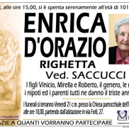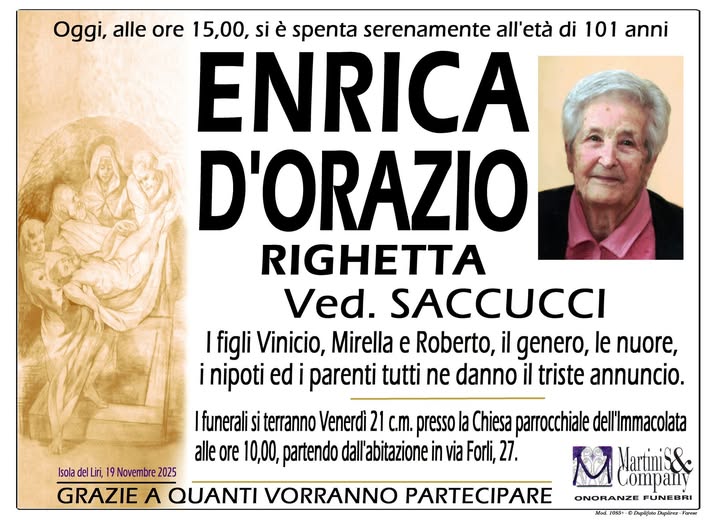 La Città di Isola Liri ha perso oggi la sua nonnina. Si è spenta a 101 anni, Enrica D'Orazio, per tutti Righetta. I funerali saranno officiati venerdì mattina, alle ore 10, nella chiesa dell'Immacolata della frazione Selva. A tutti i familiari le condoglianze dalla redazione del nostro sito.