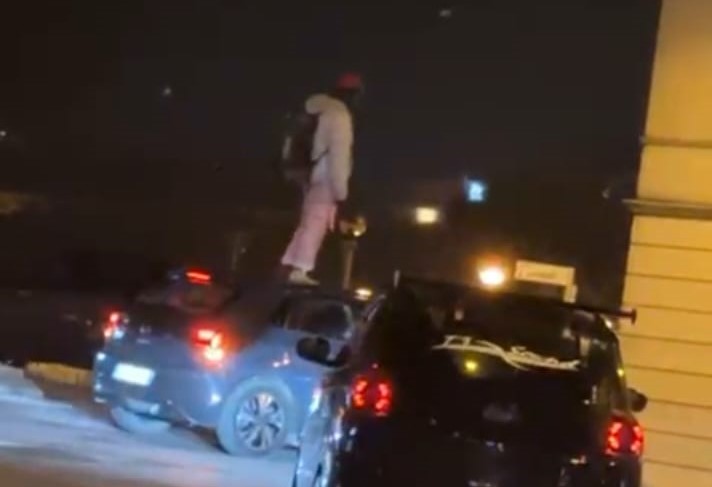 Con spaventosa agilità è salito sul tettuccio una vettura, si è messo in piedi in equilibrio. Poi è sceso passando dalla parte anteriore ma, questa volta, con un po’ più di difficoltà.