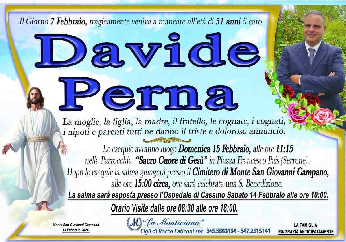 Da questa mattina alle ore 10, la salma del 51enne di Monte San Giovanni Campano, Davide Perna, tragicamente scomparso lo scorso 7 febbraio, sarà esposta presso l’ospedale di Cassino,