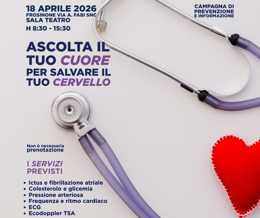La ASL di Frosinone e A.L.I.Ce. Associazione per la Lotta all'Ictus Cerebrale organizzano il 18 aprile, dalle 8:30 alle 15:30, una giornata di prevenzione e informazione verso le patologie patologie cardio-cerebrovascolari.