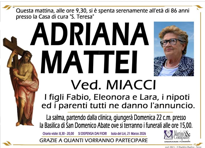 Questa mattina presso la sua casa di cura Santa Teresa di Isola Liri si è spenta la signora Adriana Mattei. Aveva 86 anni ed era la vedova del fondatore della struttura sanitaria privata, il dottor Vanni Miacci.