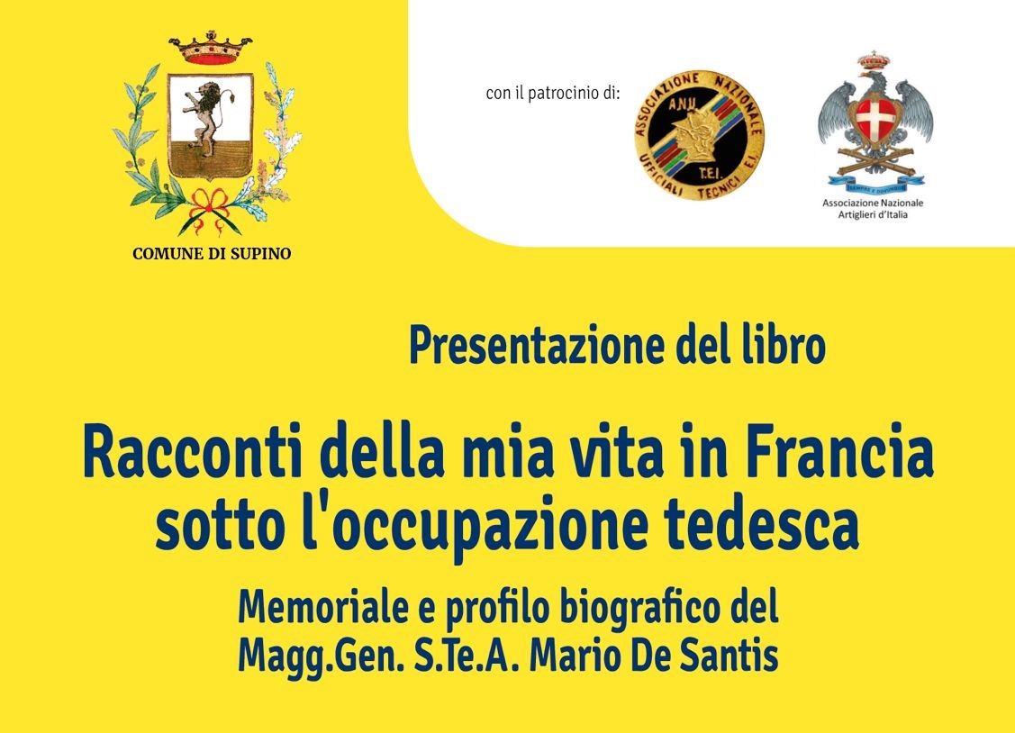 Presentazione a Supino, sabato 15 novembre alle ore 17,00 presso la sala consiliare, del libro “Racconti della mia vita in Francia sotto l’occupazione tedesca – Memoriale e profilo biografico del Magg. Gen. S.Te.A. Mario De Santis”.